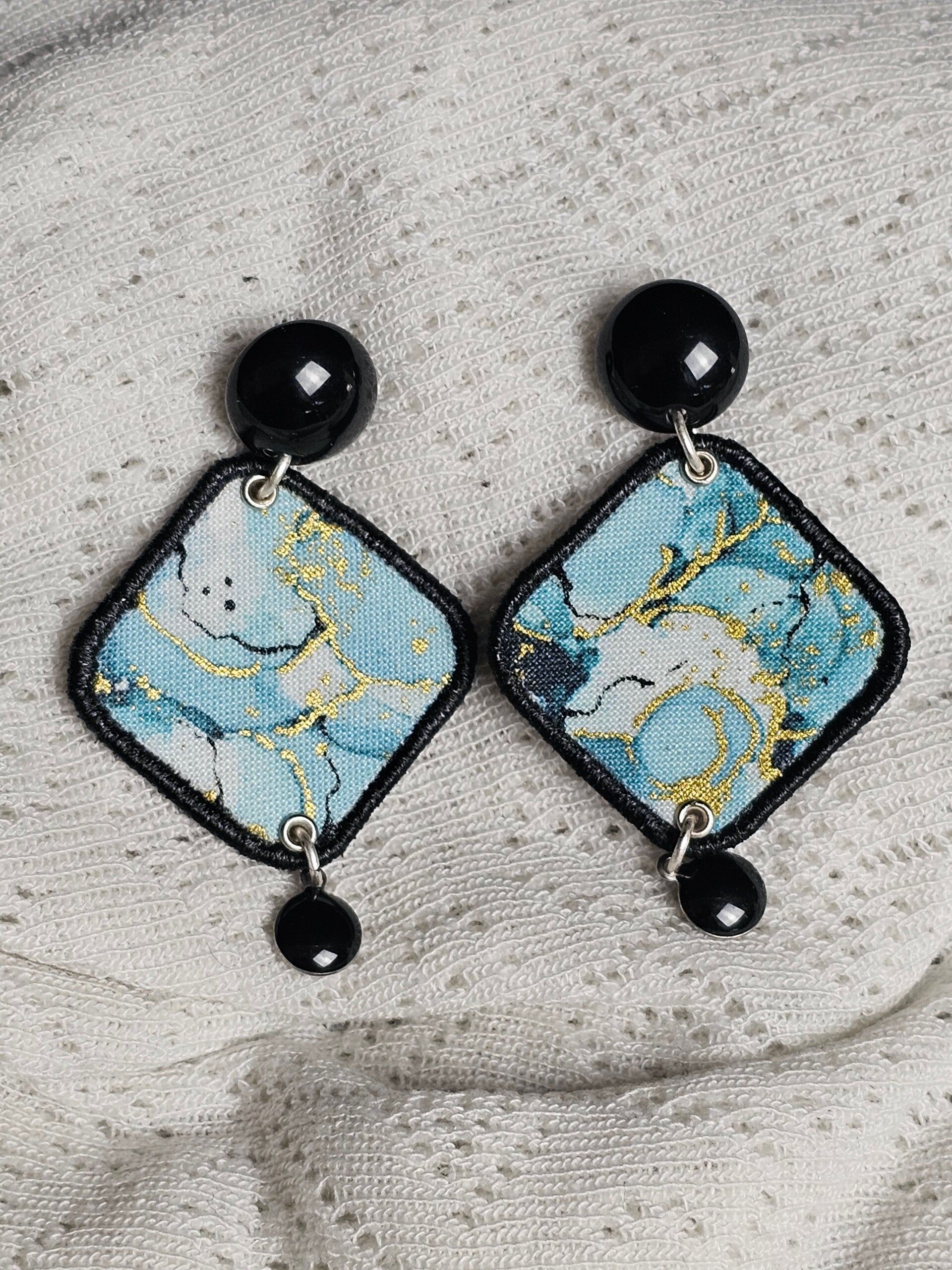 Boucles pour oreilles percées en tissu dans un camaïeu de bleus et doré.