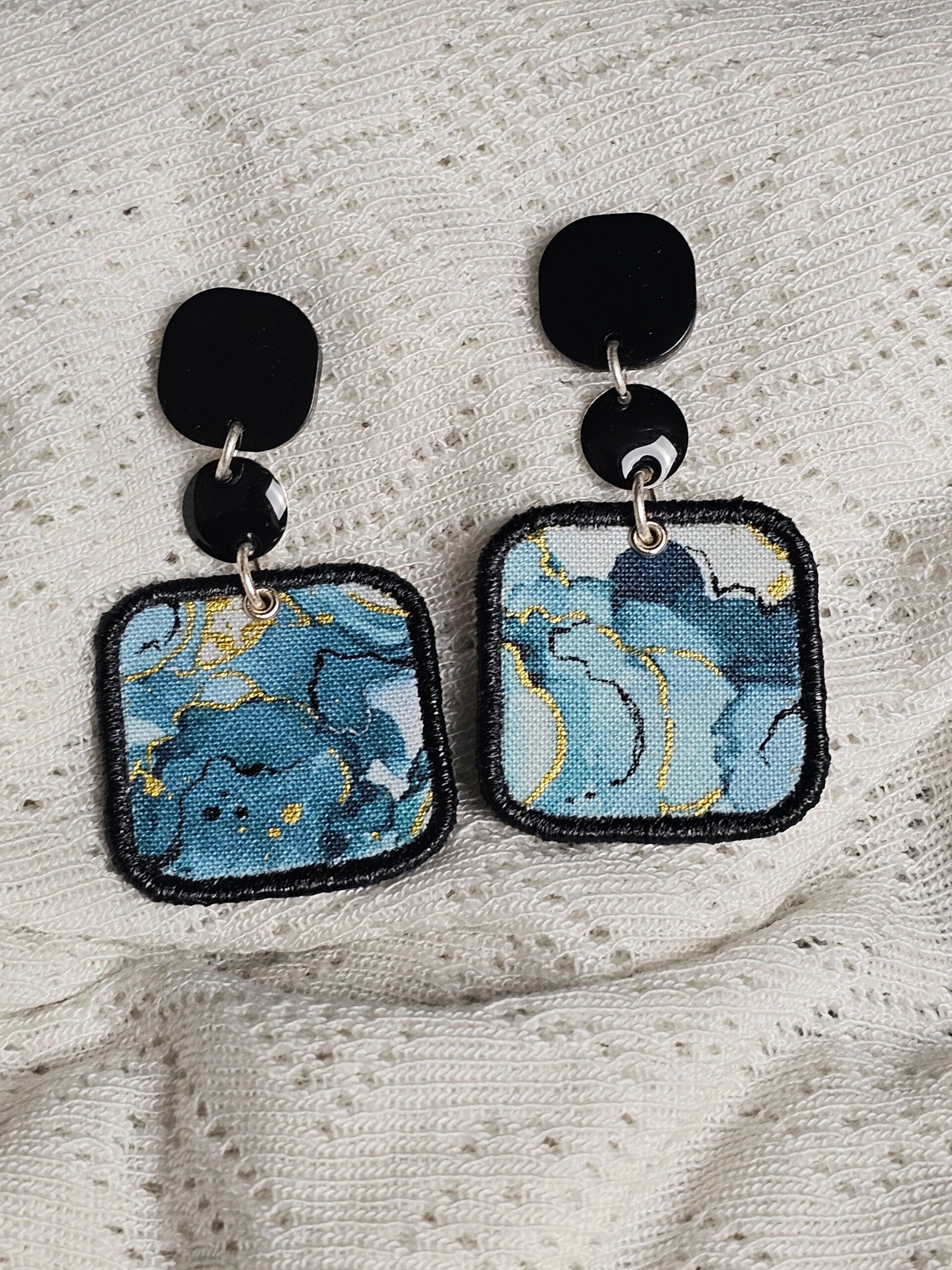 Boucles pour oreilles percées en tissu dans un camaïeu de bleus et doré.