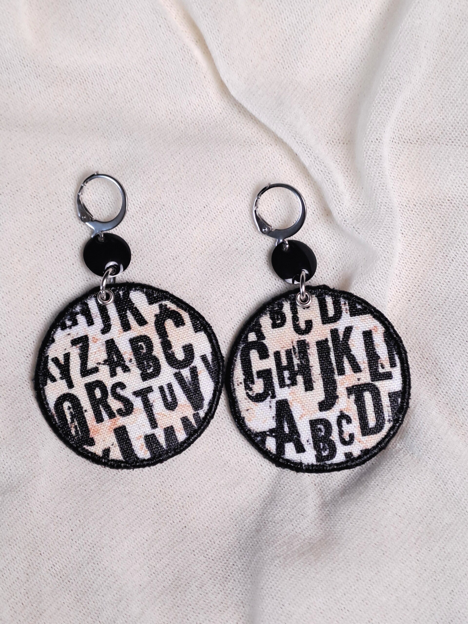 Boucles pour oreilles percées en tissu dans un camaïeu de couleurs "crèmes", avec typographie noire.