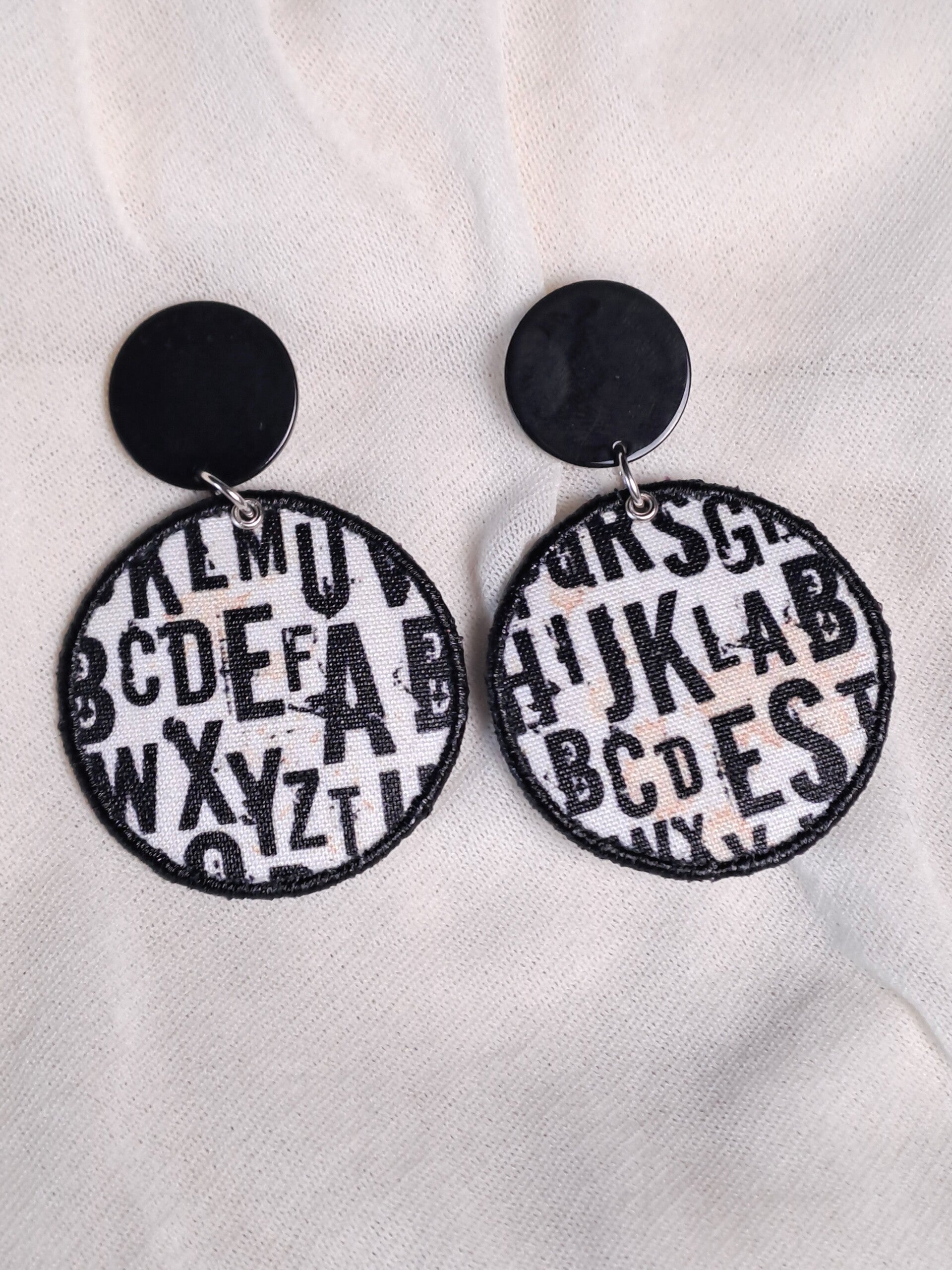 Boucles pour oreilles percées en tissu dans un camaïeu de couleurs "crèmes", avec typographie noire.