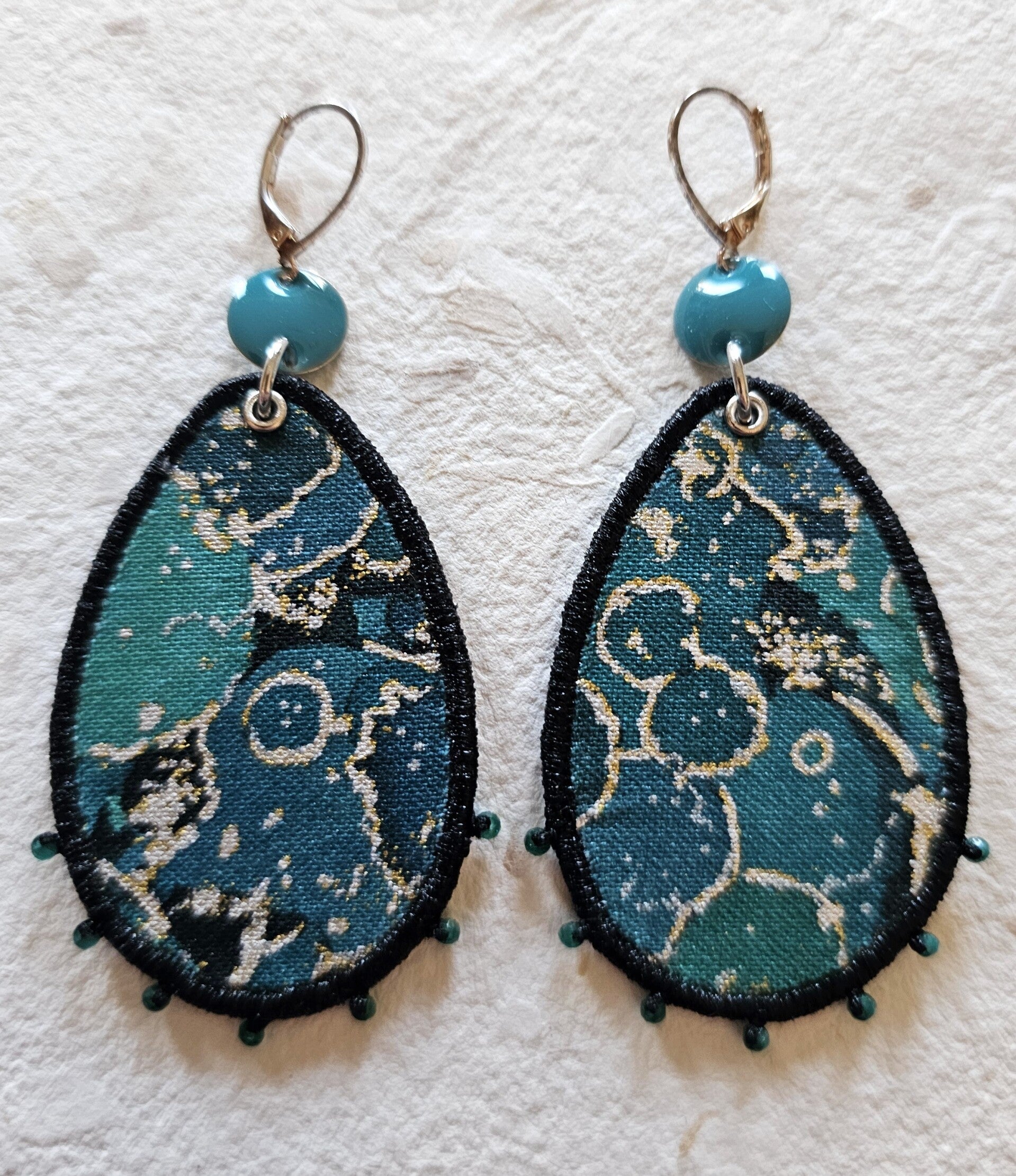 Boucles pour oreilles percées en tissu dans un camaïeu de bleus et argentés, réhaussées de petites perles en verres cousues mains.