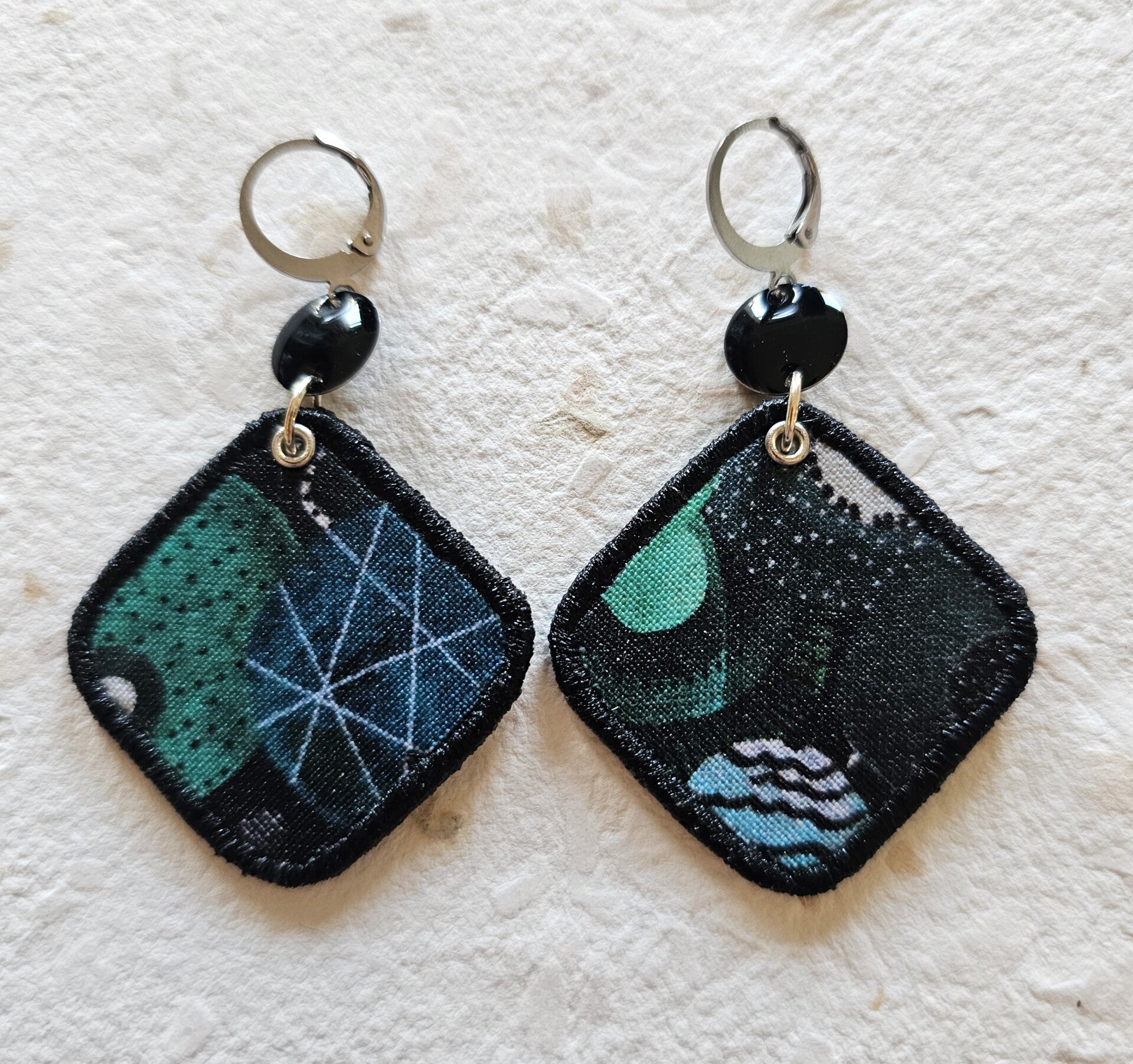 Boucles pour oreilles percées en tissu dans un camaïeu de verts et bleus.
