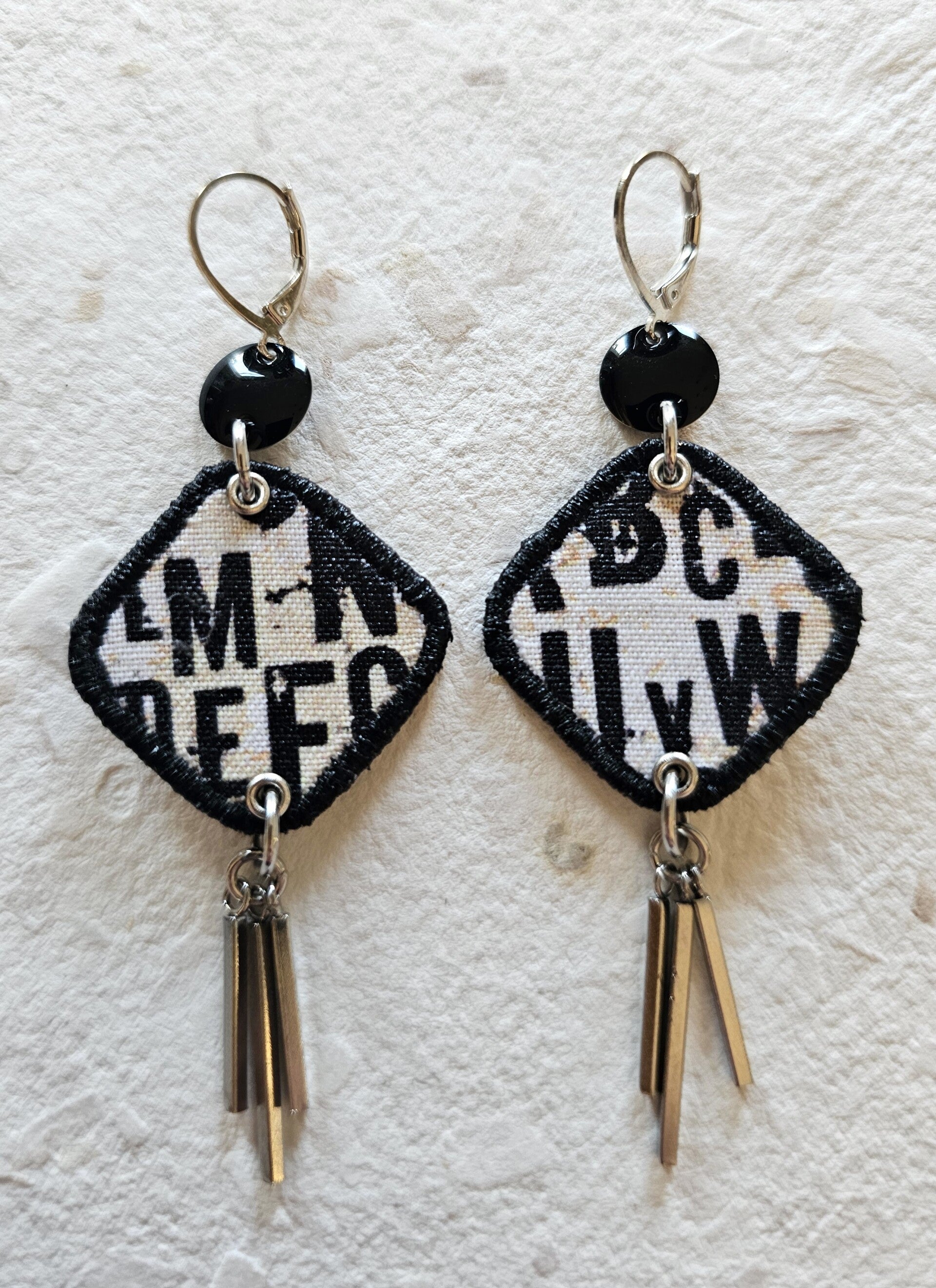 Boucles pour oreilles percées en tissu dans un camaïeu de couleurs "crèmes", avec typographie noire.