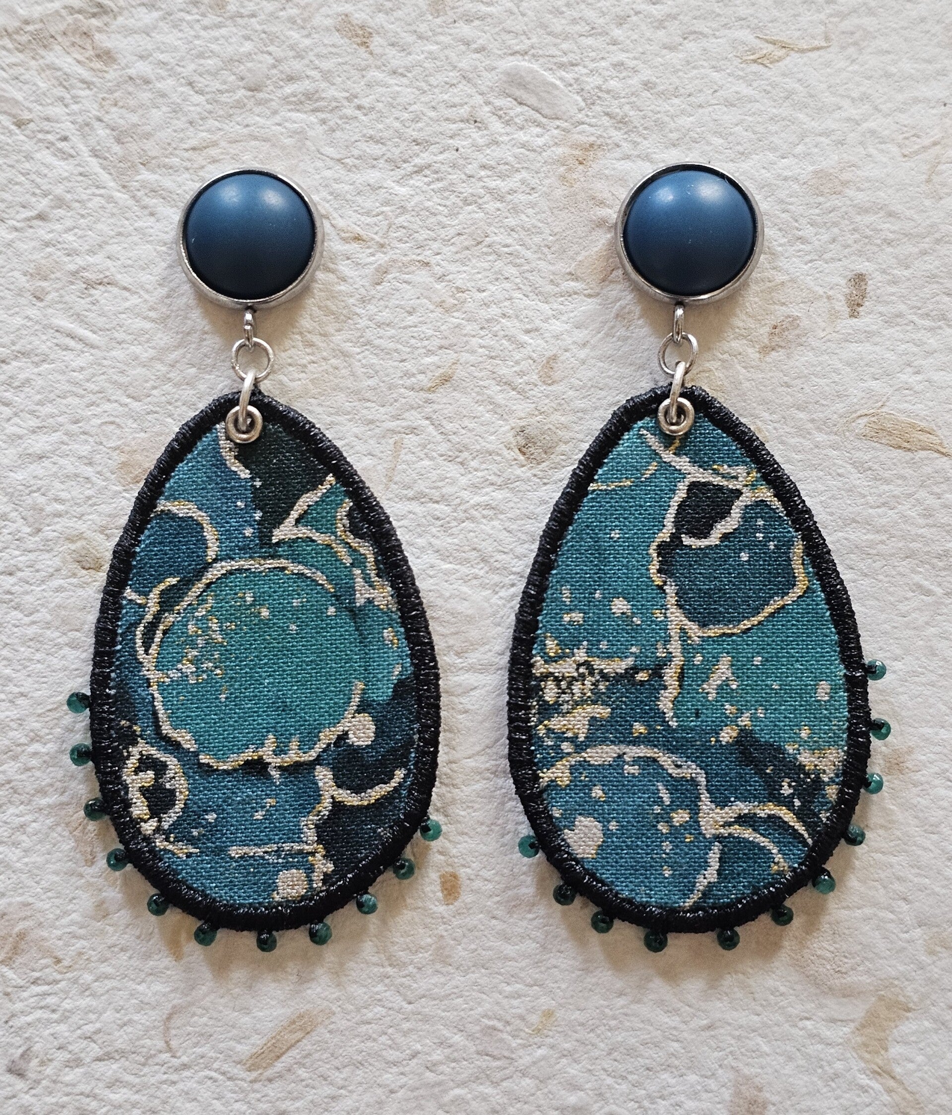 Boucles pour oreilles percées en tissu dans un camaïeu de bleus et argentés, perles en verre cousues mains.