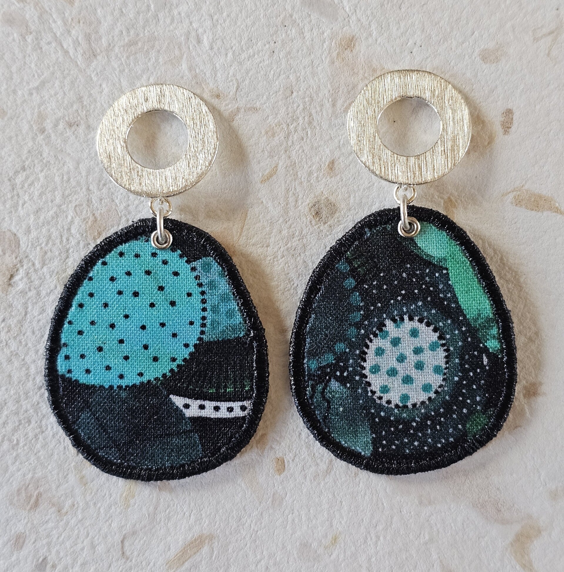 Boucles pour oreilles percées en tissu dans un camaïeu de verts et bleus.