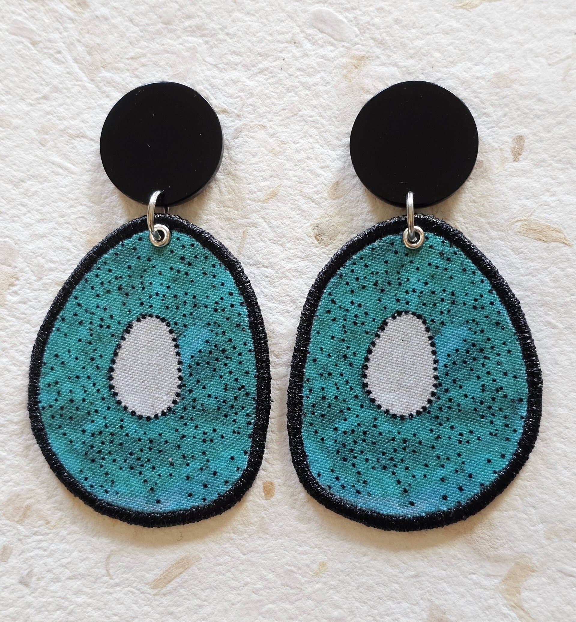 Boucles pour oreilles percées en tissu dans un camaïeu de verts et bleus.